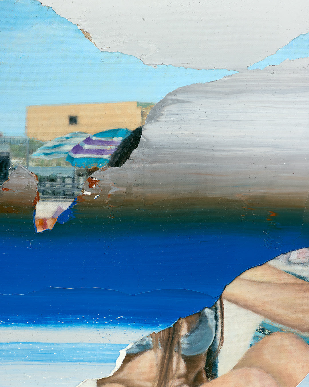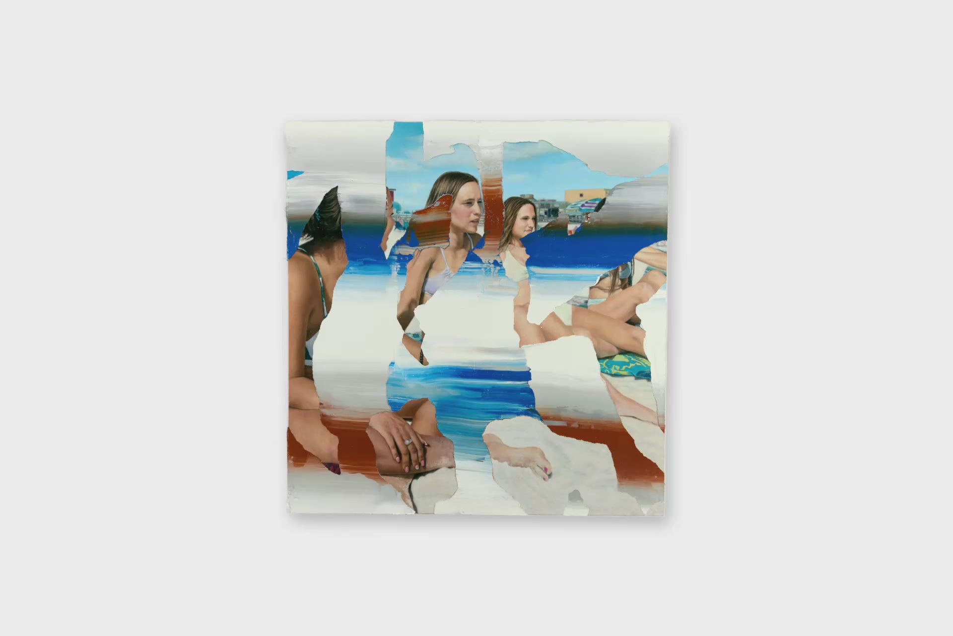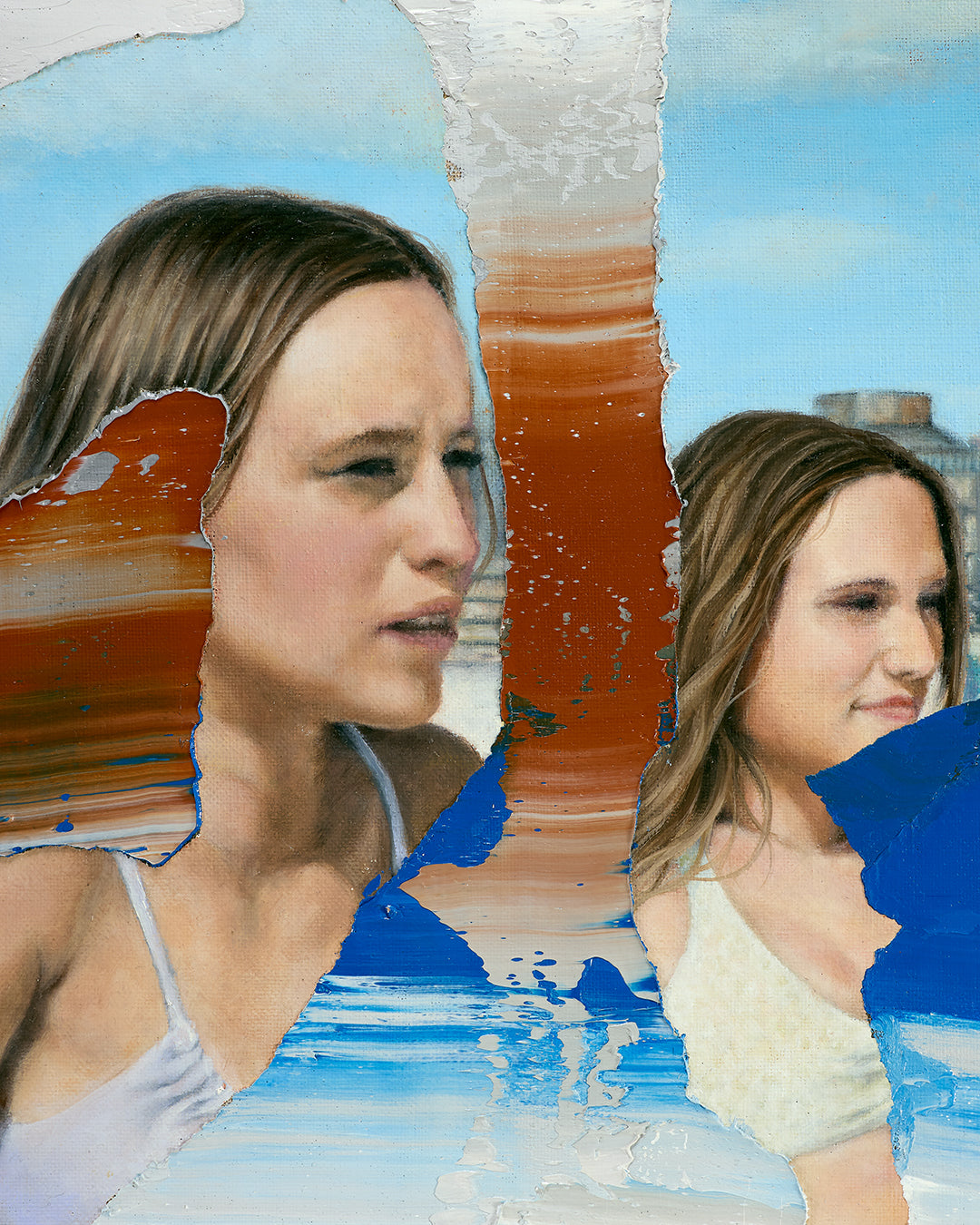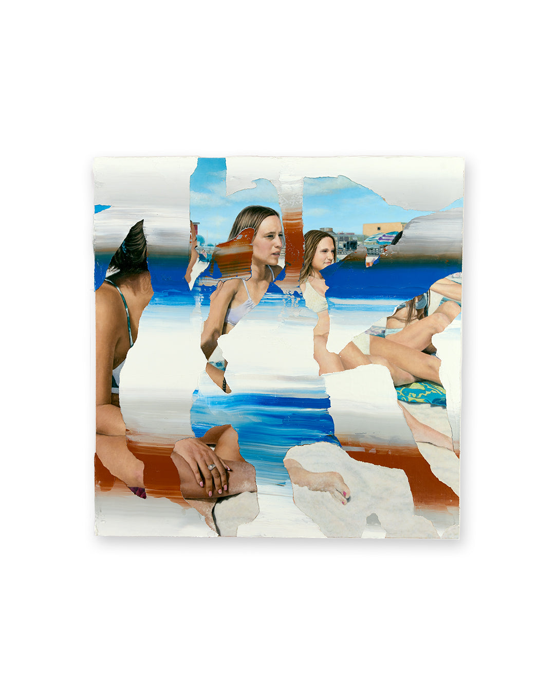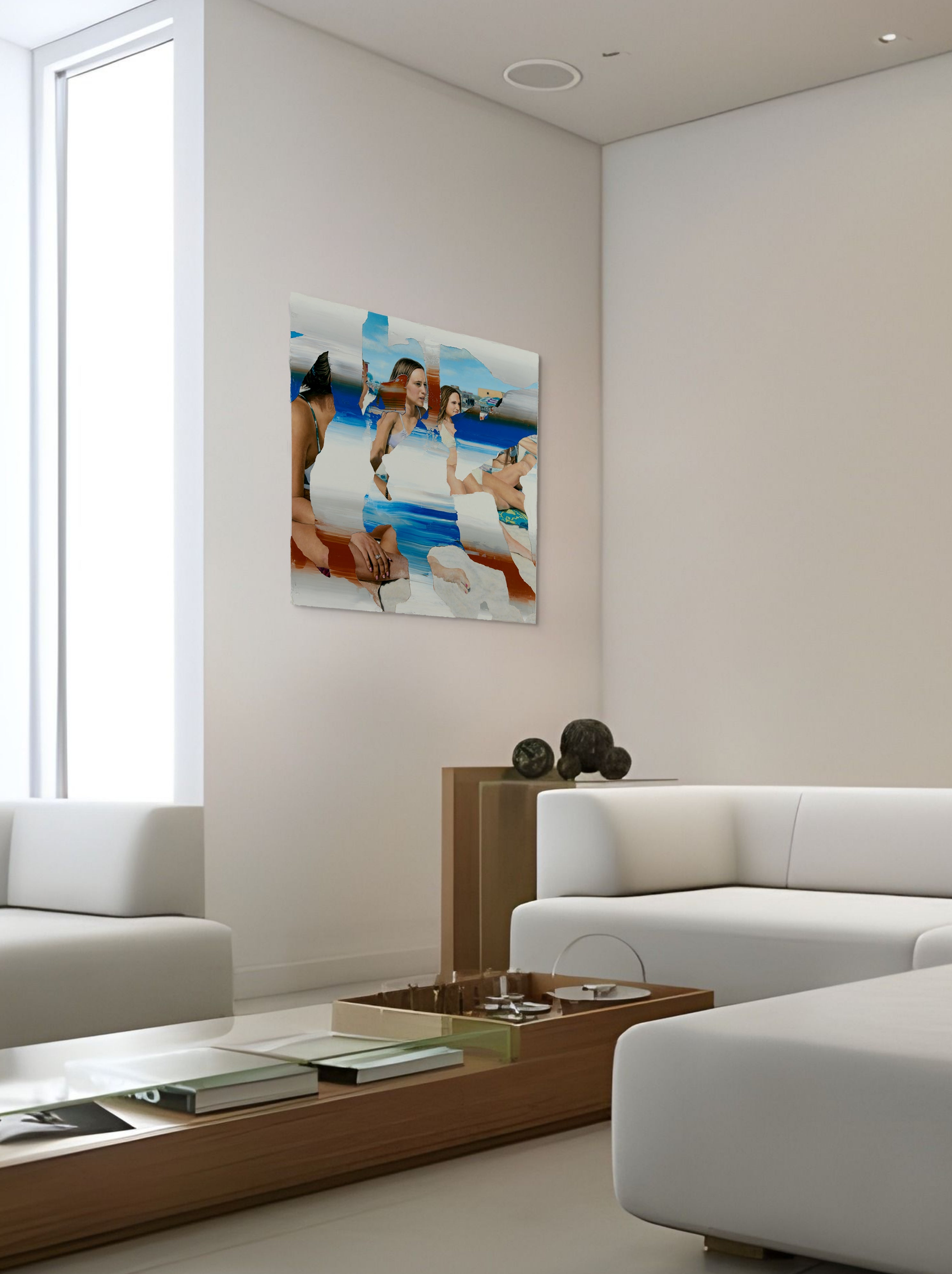 A bright expanse of sky over ocean stretches across the surface, its calm tones layered with the illusion of torn fragments. Beneath, a Baroque-inspired scene emerges. Women are seated together, all turned to the right, with their forms painted in intricate detail. The juxtaposition is striking, as though centuries have been folded into a single frame.