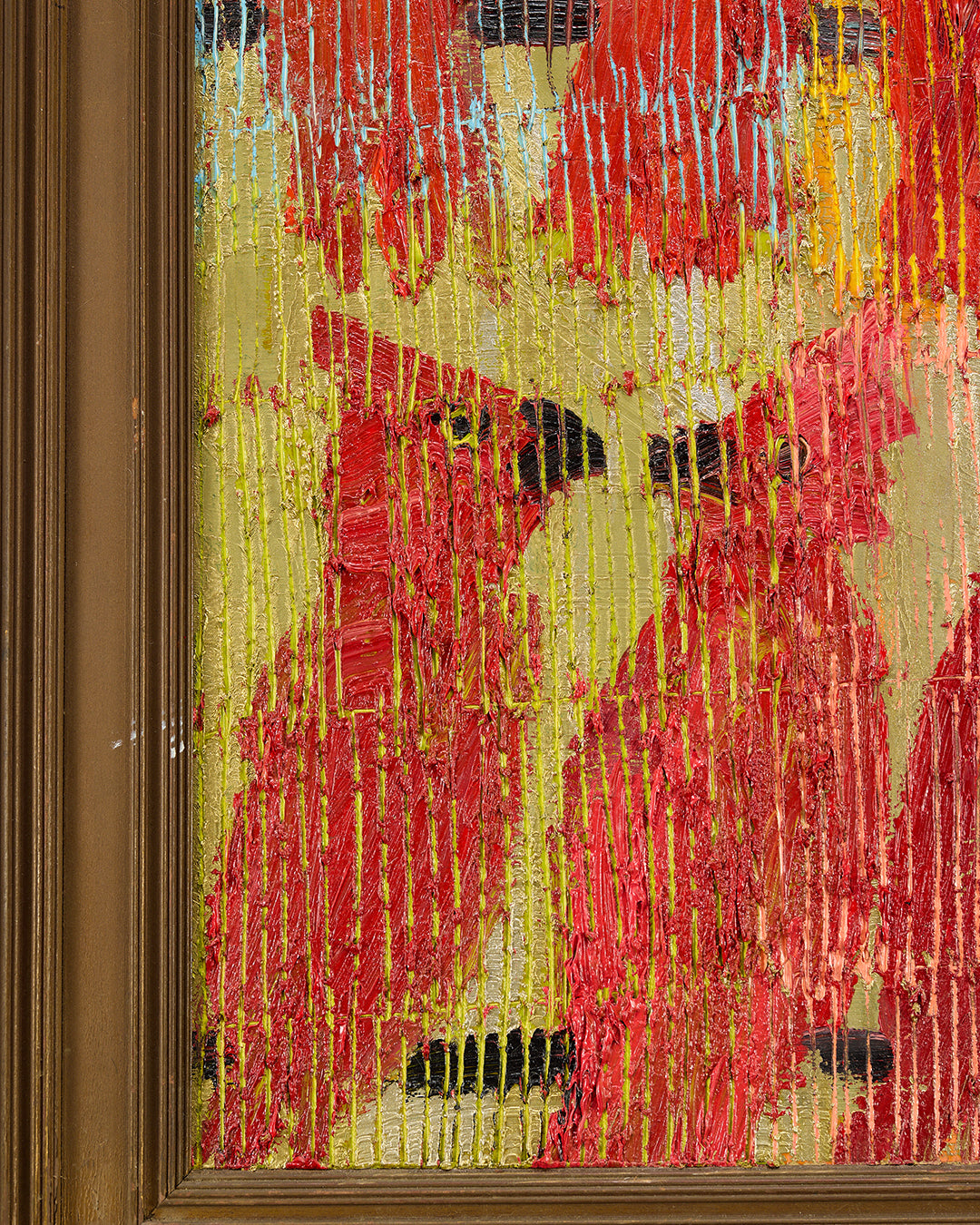 Slonem’s art practice is prolific, and his work is characterized by an obsessive repetition of imagery, which he sees as a form of meditation. His paintings often feature crosshatched, impasto surfaces, giving them a textural, almost sculptural quality. In addition to painting, Slonem is known for his large-scale sculptures, interior design projects, and his passion for restoring and preserving historic homes, which he decorates with his own artwork and antique collections.