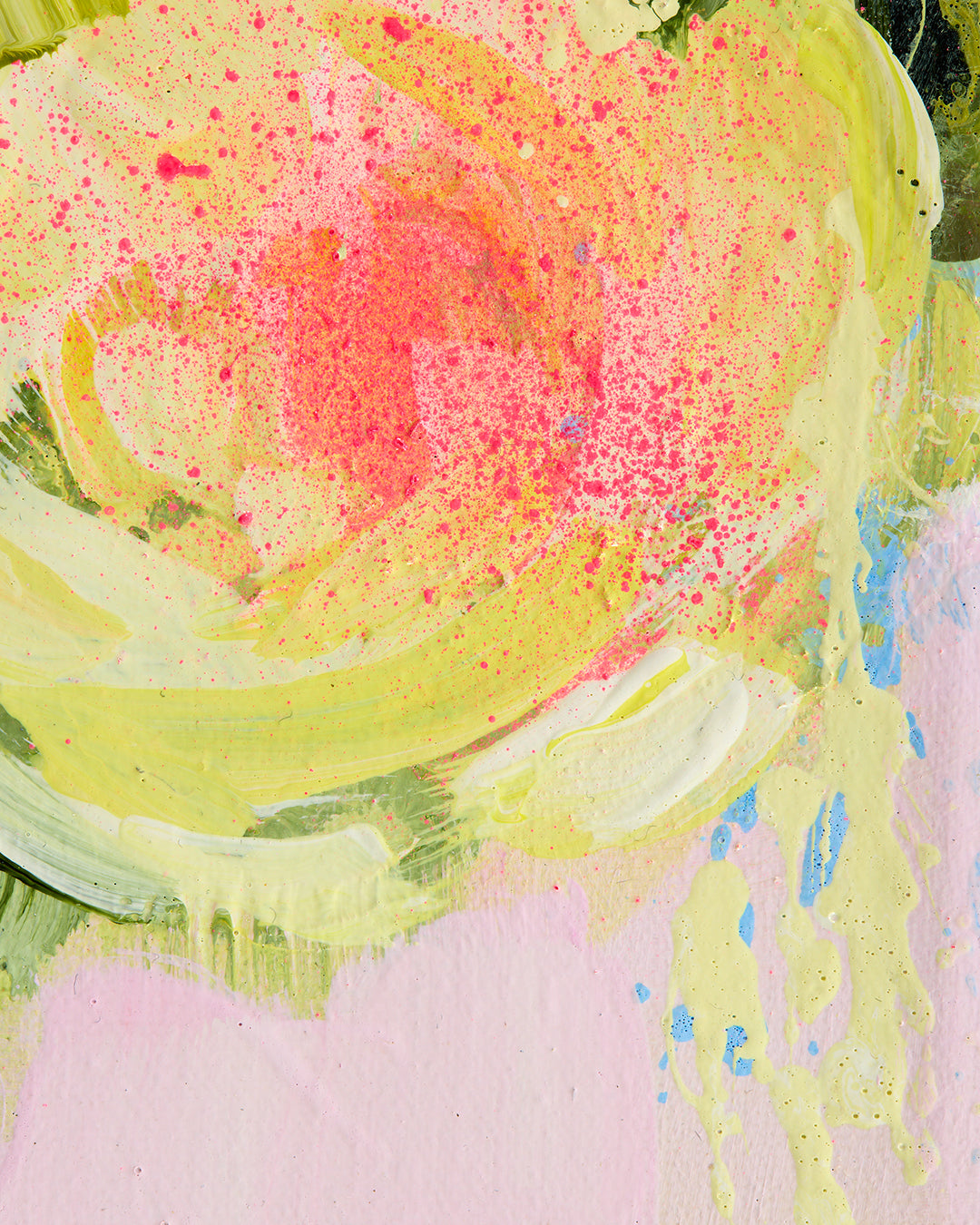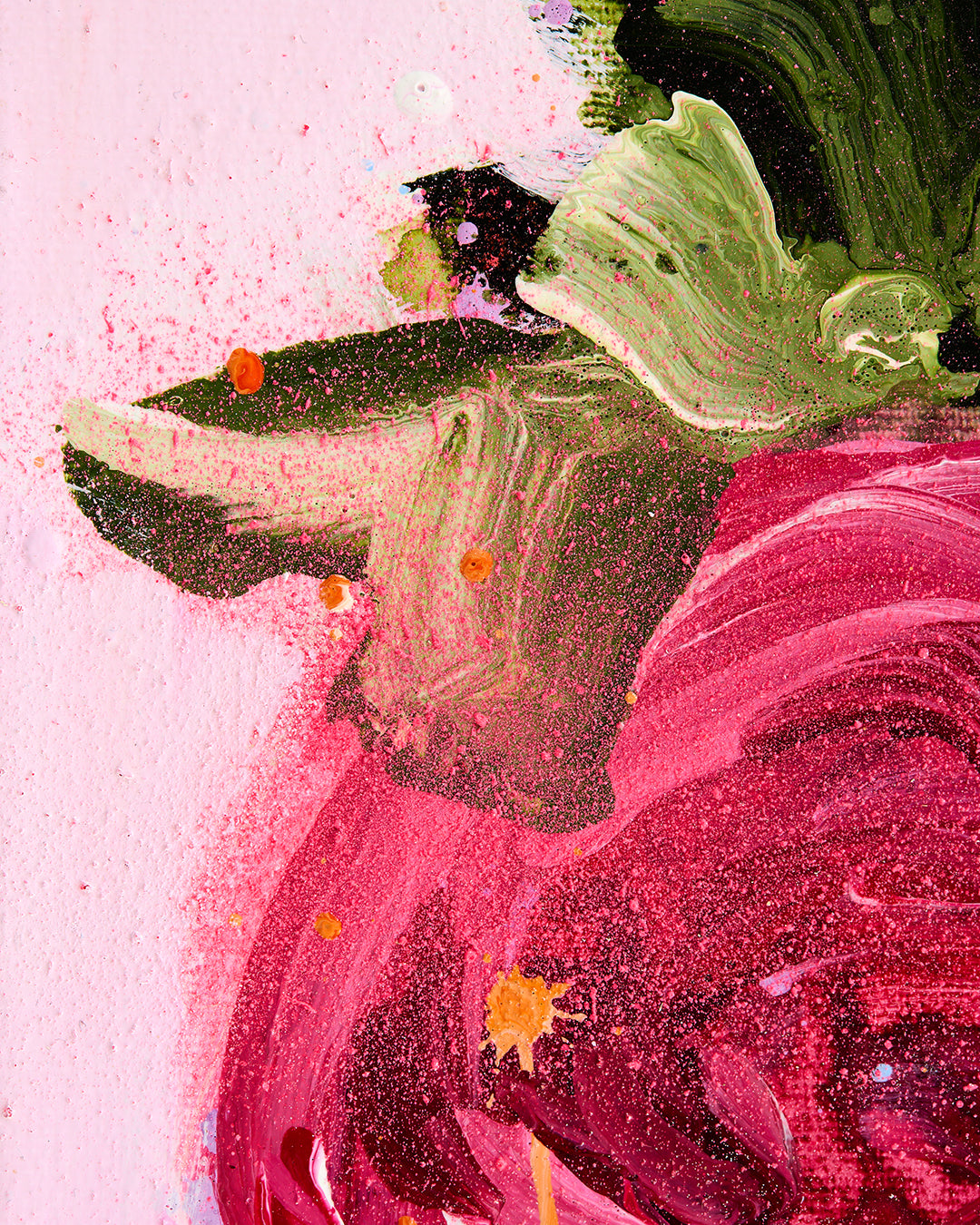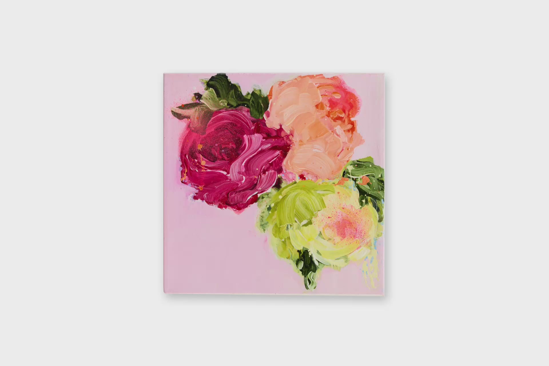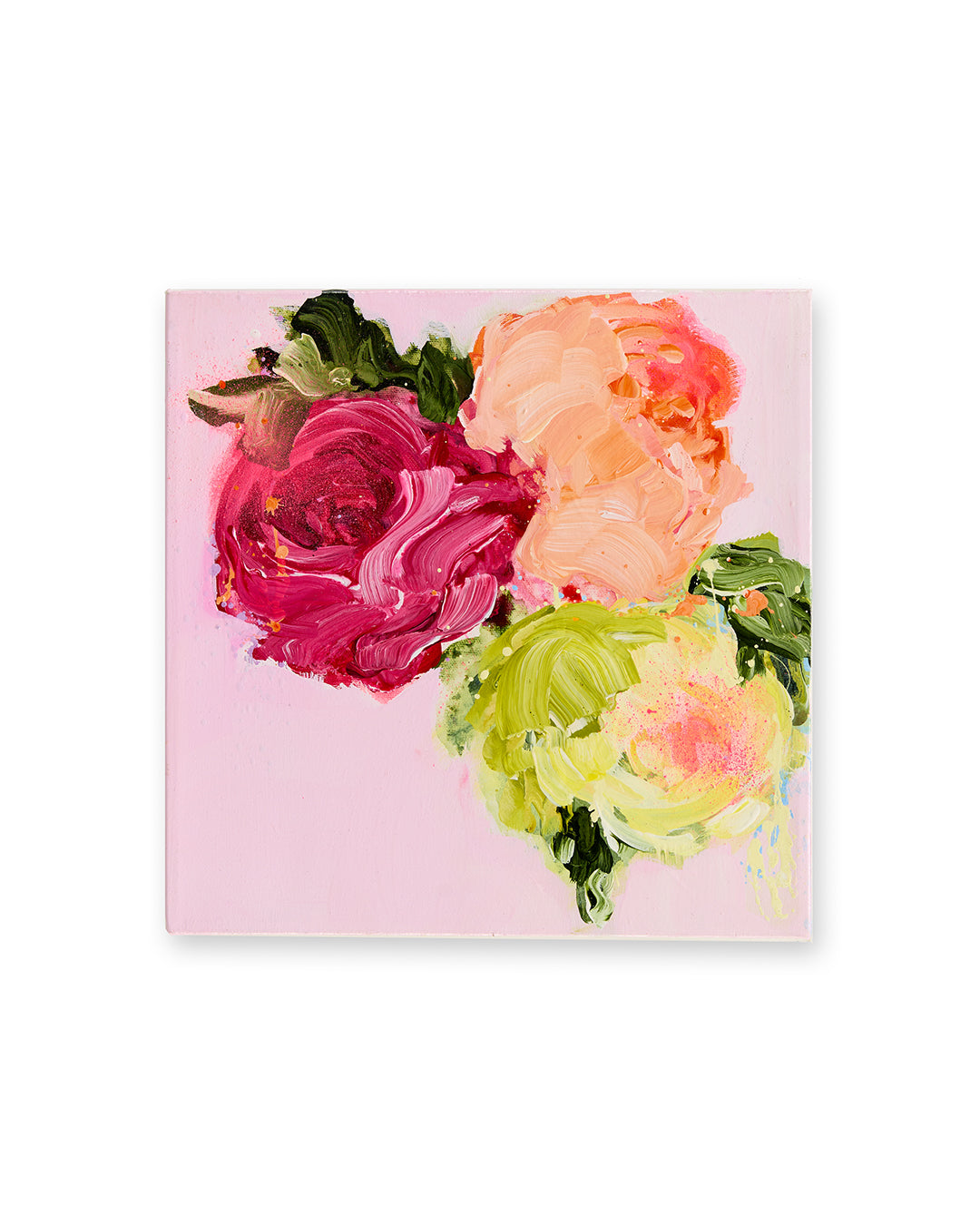 Crafted on canvas, Electric Love by Rundi Phelan depicts several detailed, textured flowers in front of a beautiful pink background.
