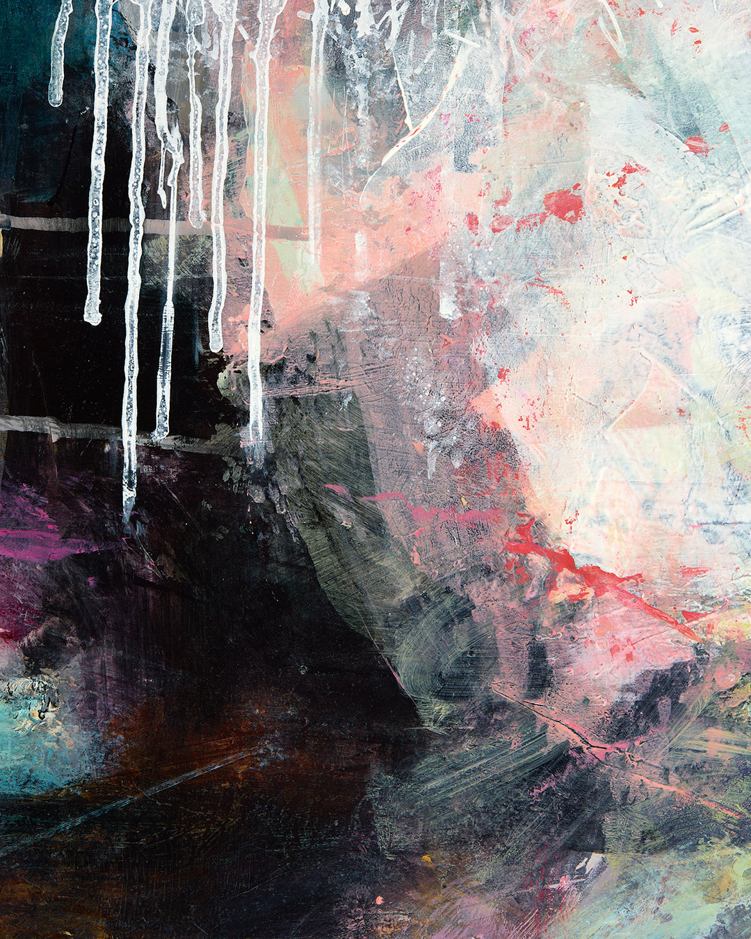 Crafted on canvas, Fly Me To The Moon by Aadila Munshi is a large vertical acrylic painting that depicts a dark and vibrant abstract scene with splashes of white paint against a deep underpainting.