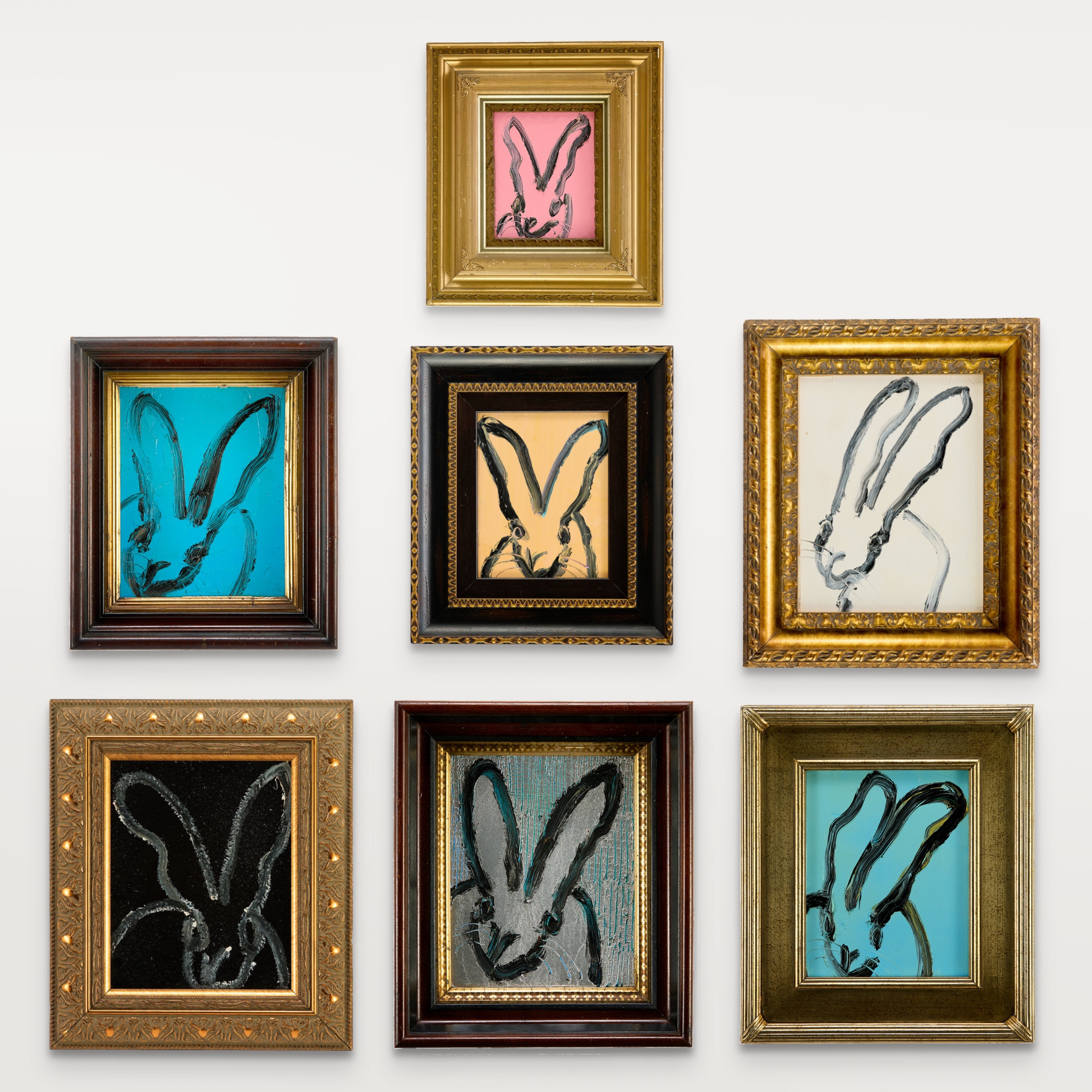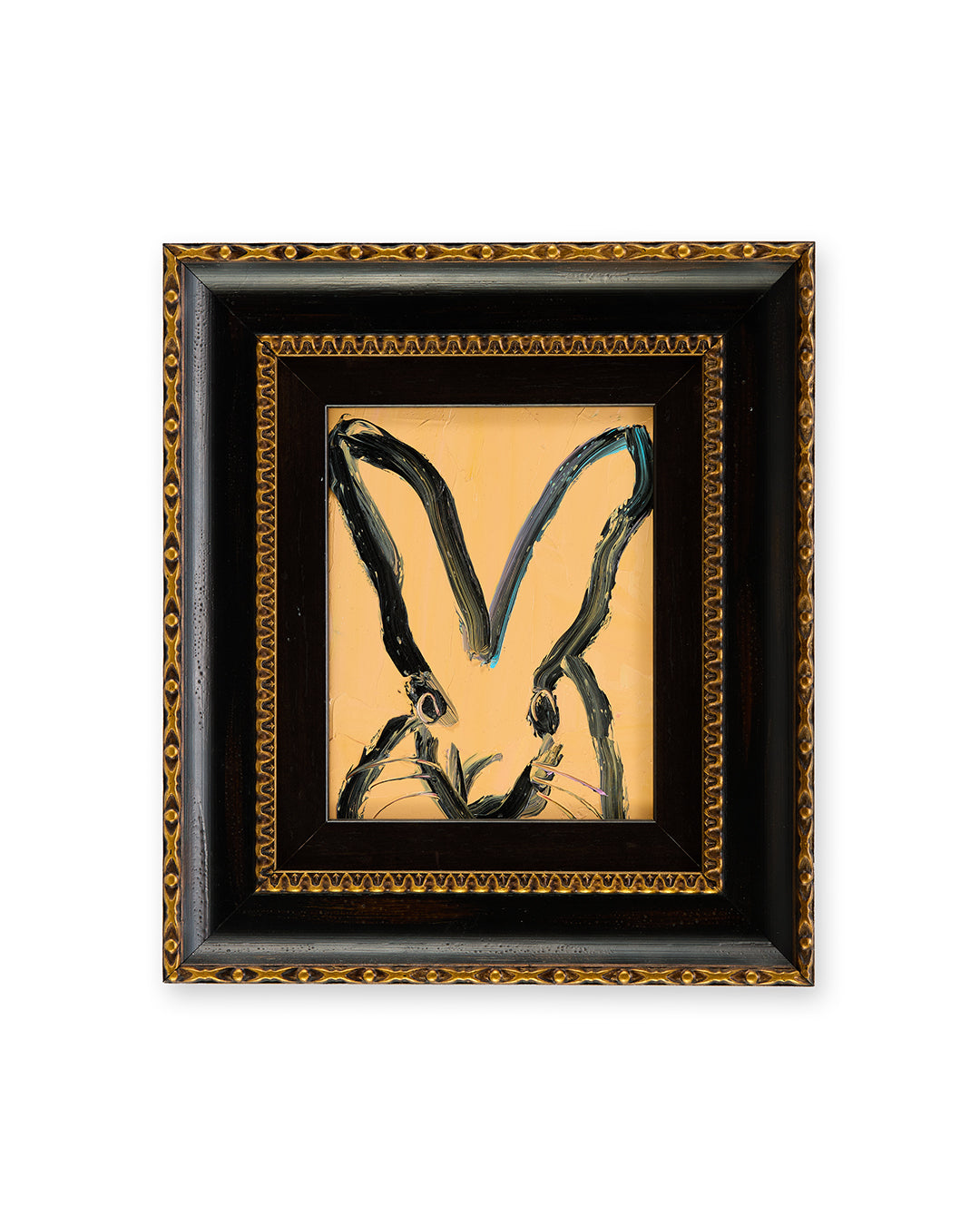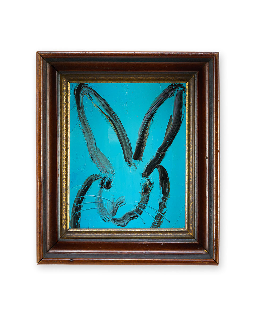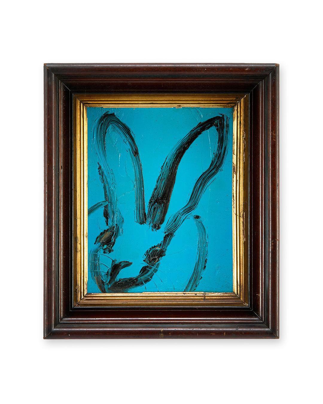 KFJ02478 by Hunt Slonem captures a flicker of joy mid-hop, featuring a singular black-outlined bunny rendered in his signature gestural style against a luminous turquoise ground that creates movement, texture, and playful energy. Painted in oil on panel and framed in a hand-selected antique, the piece balances classic elegance with contemporary charm. Its intimate scale makes it perfect for a gallery wall, entryway, or vignette where it can infuse color, personality, and joy.