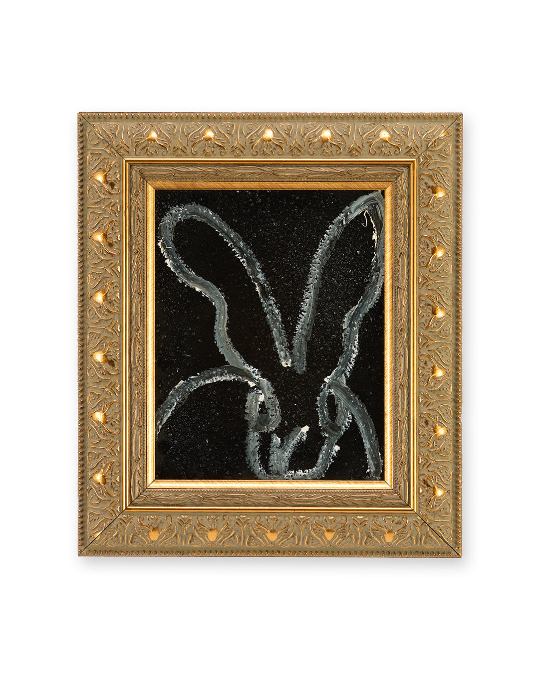 Pixie by Hunt Slonem features one of the artist’s signature bunnies rendered in black and white on wood panel, nestled in a vintage gold-toned frame personally selected by the artist. The intimate 8 × 10 in piece highlights Slonem’s playful energy and subtle textures, inviting close viewing. Ideal for a reading nook, entryway console, or curated wall, Pixie sparkles in natural or ambient light, bringing warmth and personality to any space.