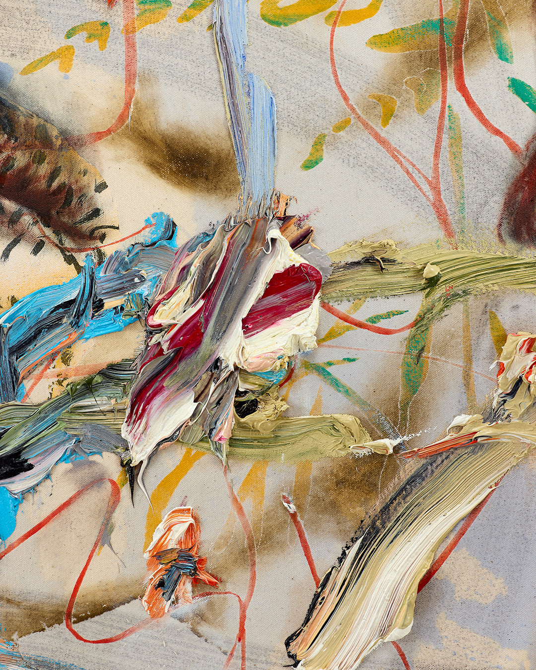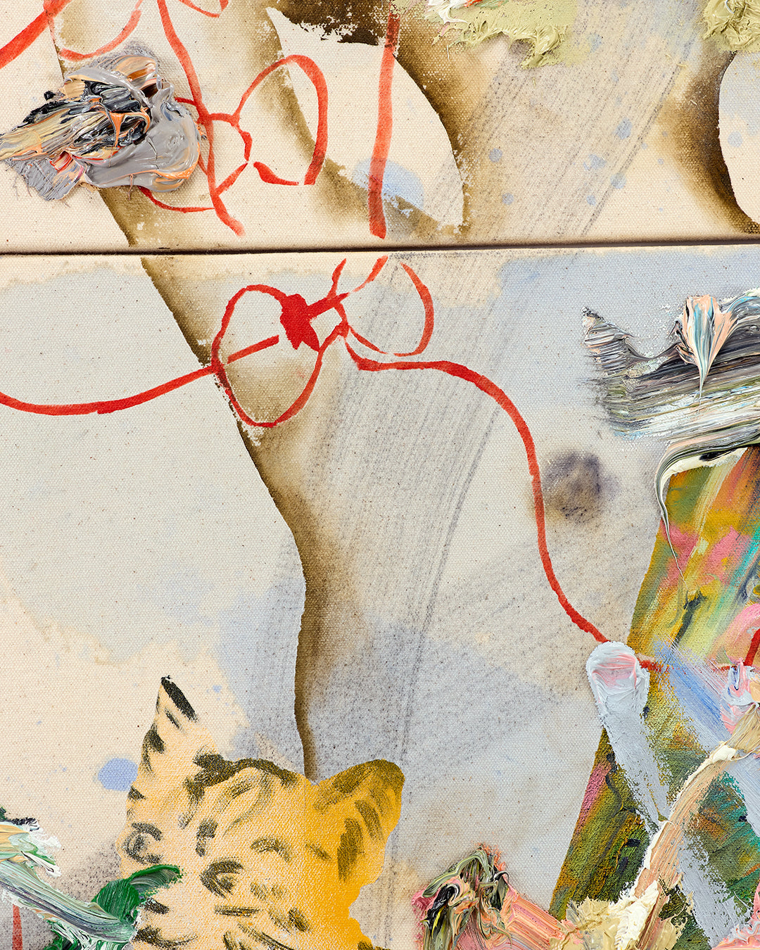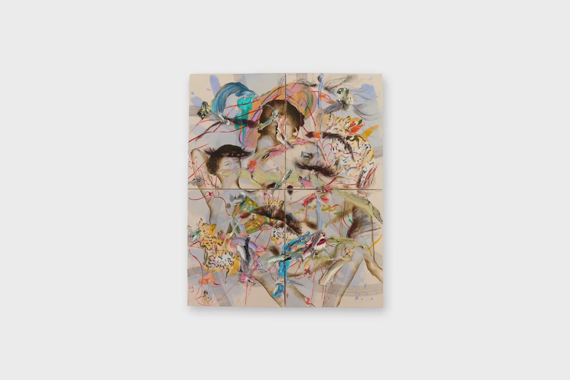 Floating women’s faces, cascading hair, and delicate eyelashes emerge within a vibrant abstract landscape. Animal prints are scattered throughout, weaving a sense of rhythm and pattern into the composition. The interplay of figuration and abstraction creates a surreal narrative, at once intimate and untamed.