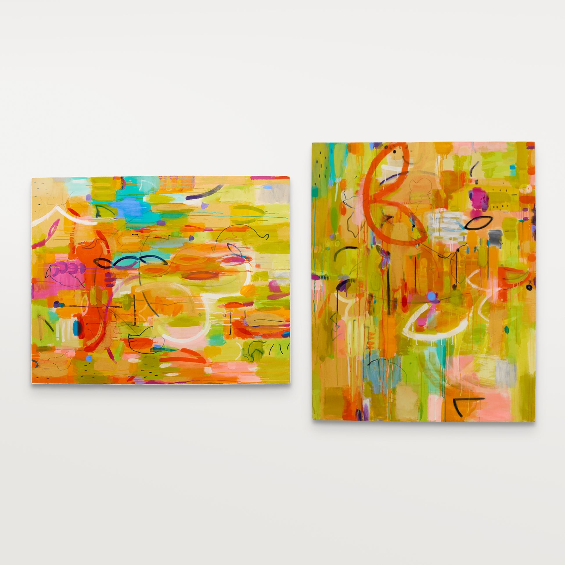 Wow #1 by Mimi Laplant is a vibrant painting on wood featuring broad, expressive brushstrokes over soft abstract form...