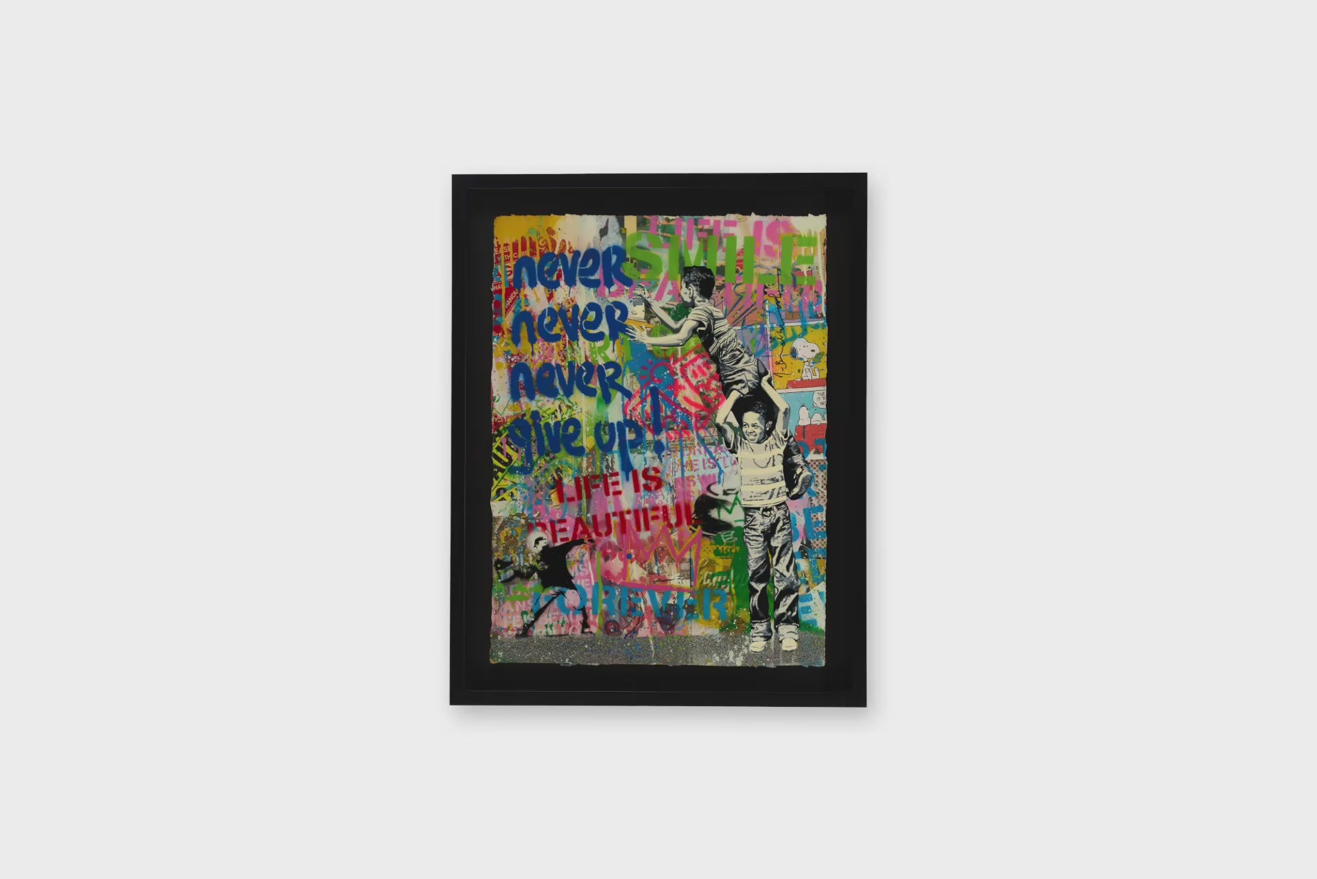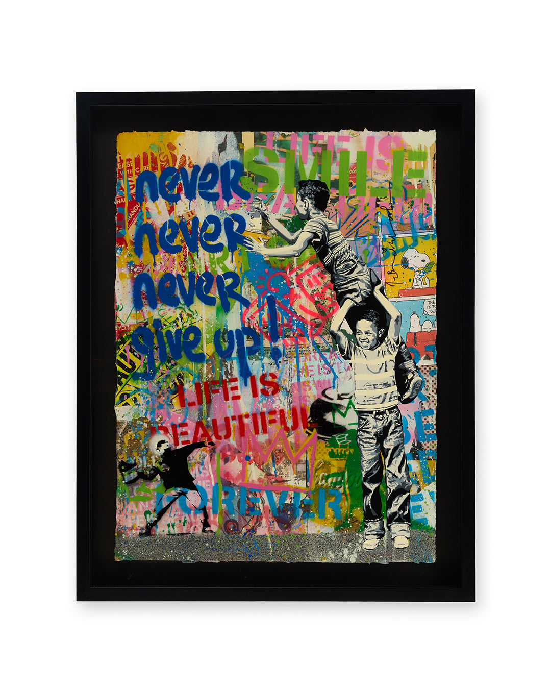 Never Give Up, painted by Mr. Brainwash, features a mixed media text and collage on paper, creating a vibrant and colorful display in this painting.
