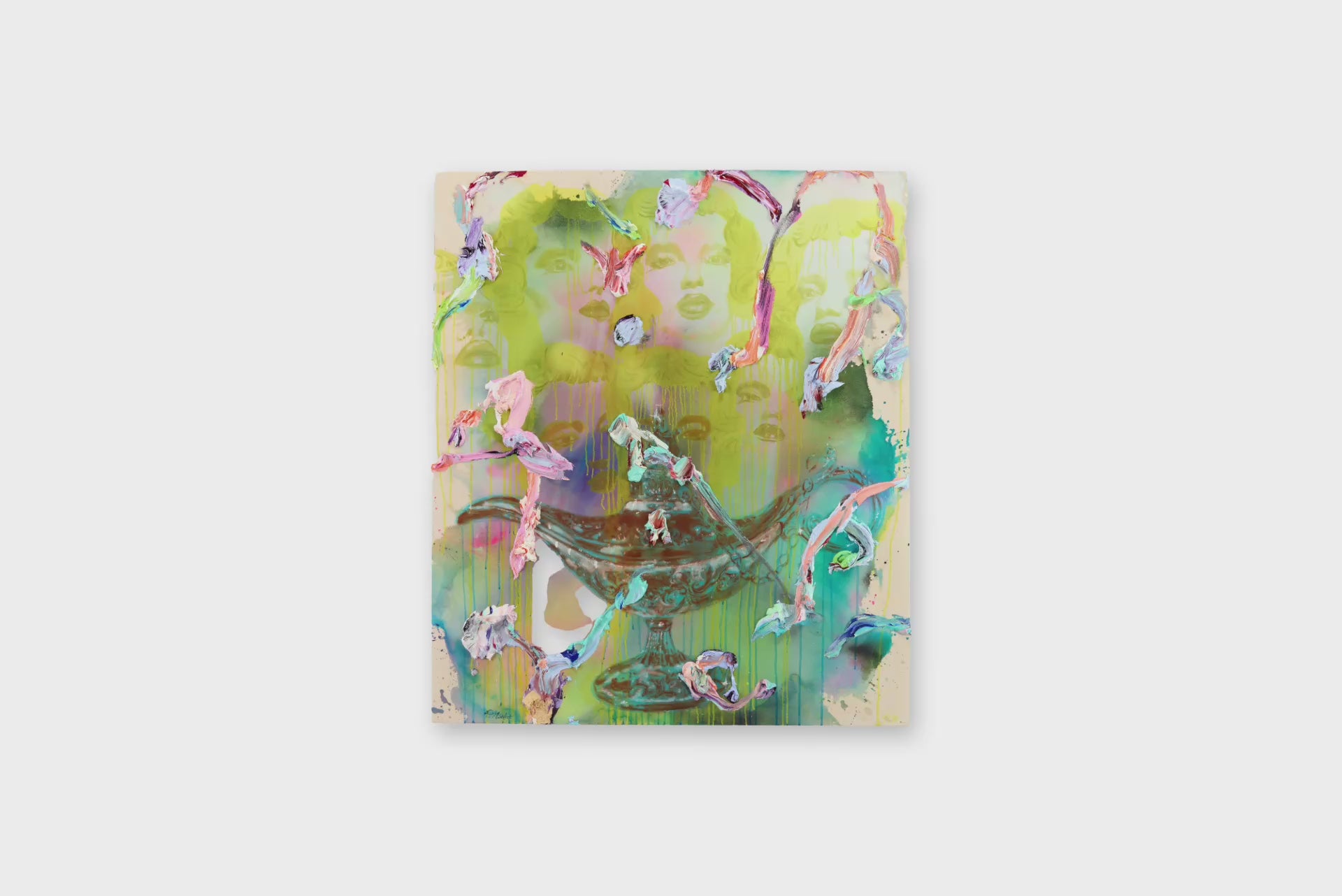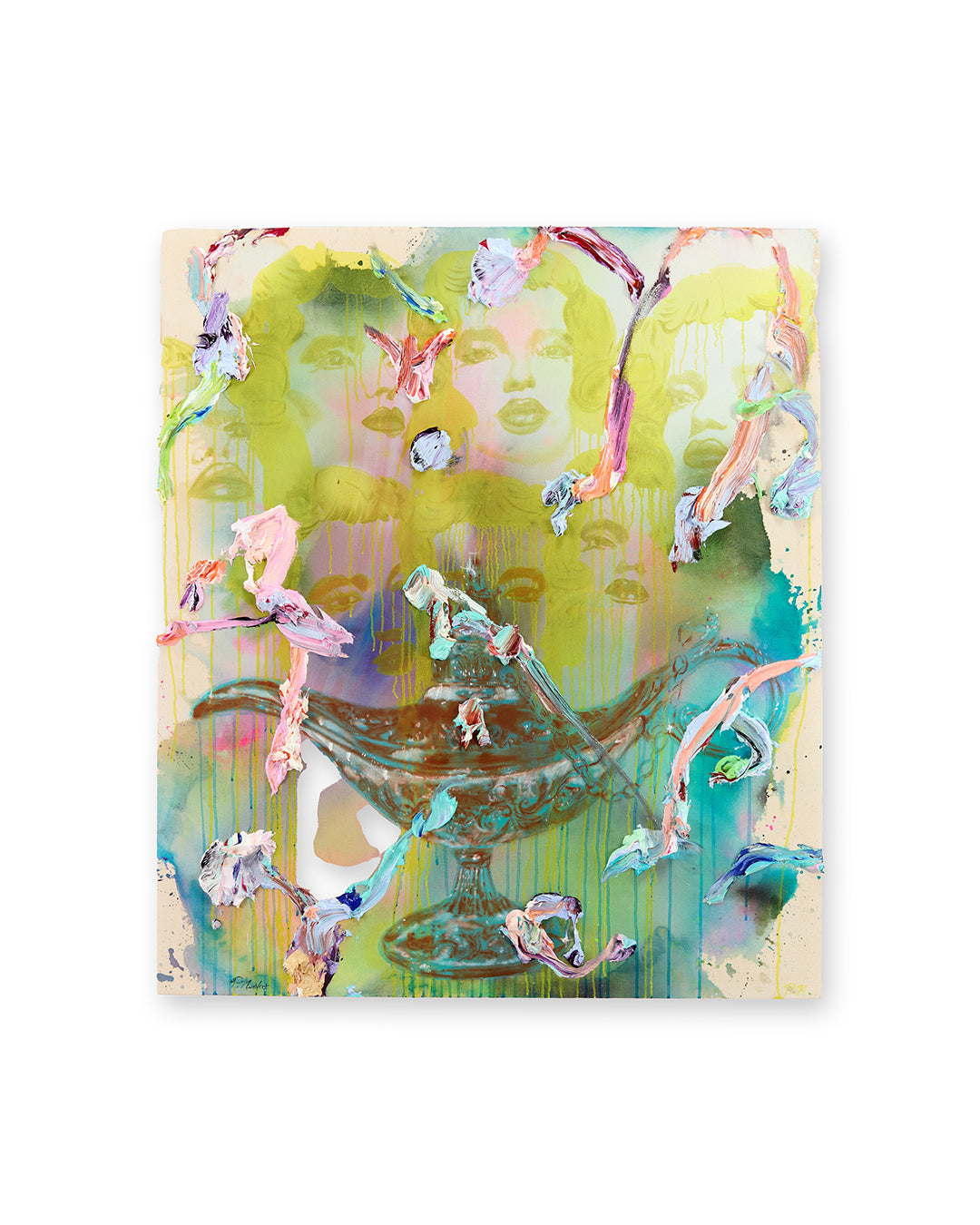 Somnolence by Marie P. Mudafort is an oil on canvas that explores the threshold between the real and the imagined. A woman’s face glows subtly from the background, partially veiled by sweeping strokes of textured paint. At the center, a genie-style lamp hovers, its presence both mystical and symbolic, suggesting the weight of memory, desire, or wish.