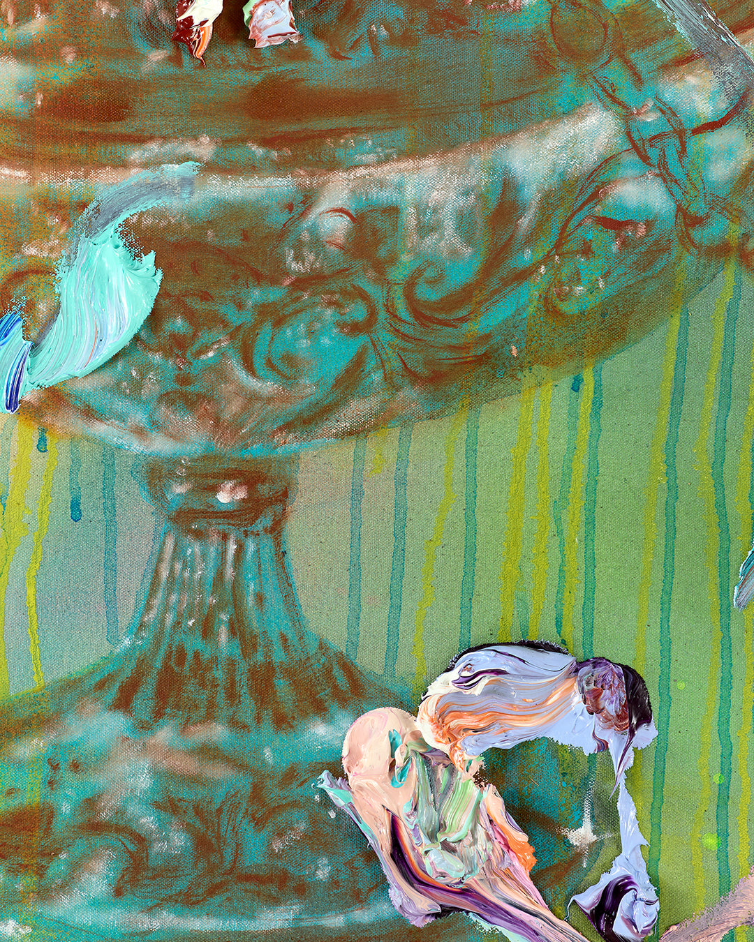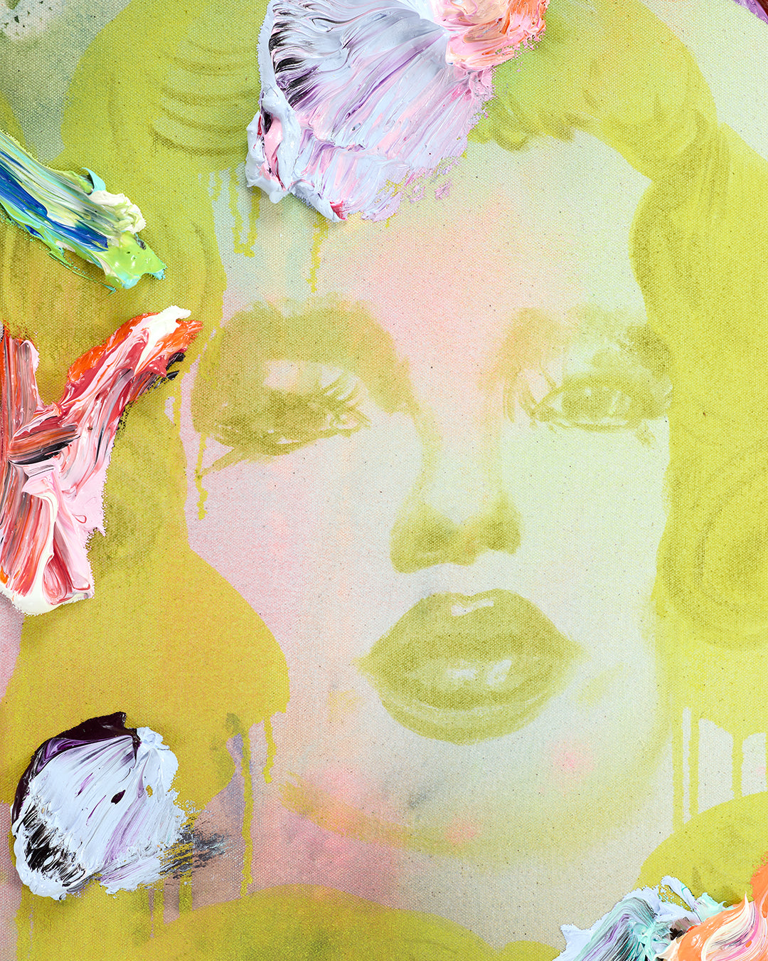 The surface is alive with contrast. Large, expressive oil brushstrokes rest above a base layer of soft, blended hues that recall the fluidity of tie-dye or vapor. This interplay between precision and looseness creates depth, movement, and a sense of shifting dream states.
