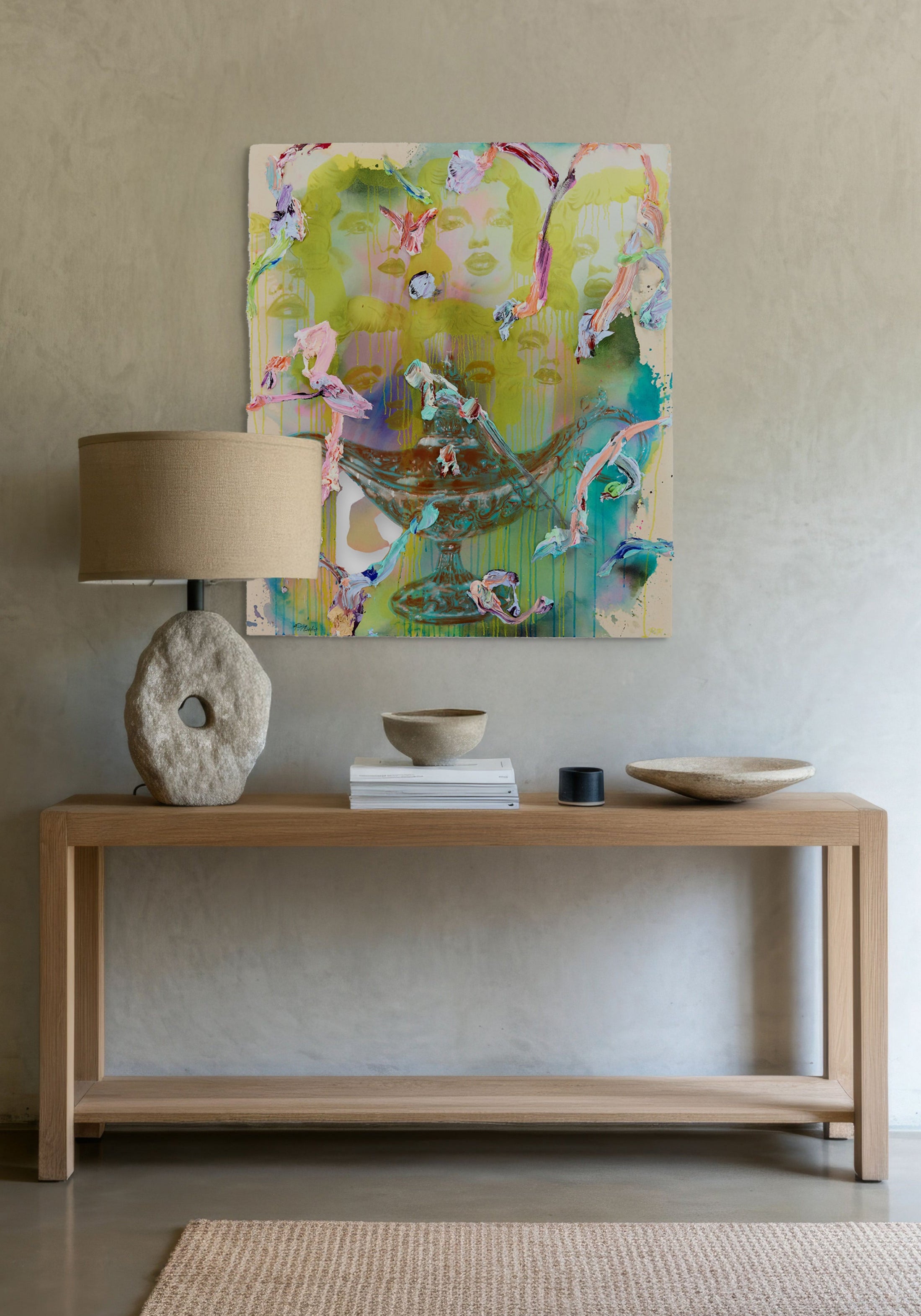 Both enigmatic and magnetic, this artwork would make a striking statement wall piece, transforming any space with its scale and layered symbolism.