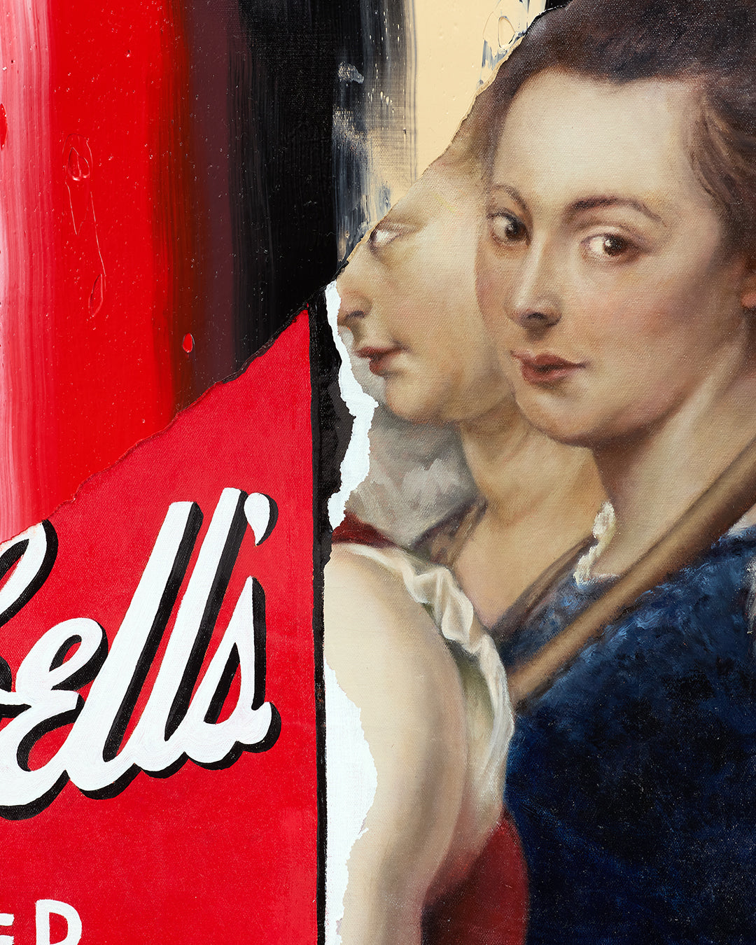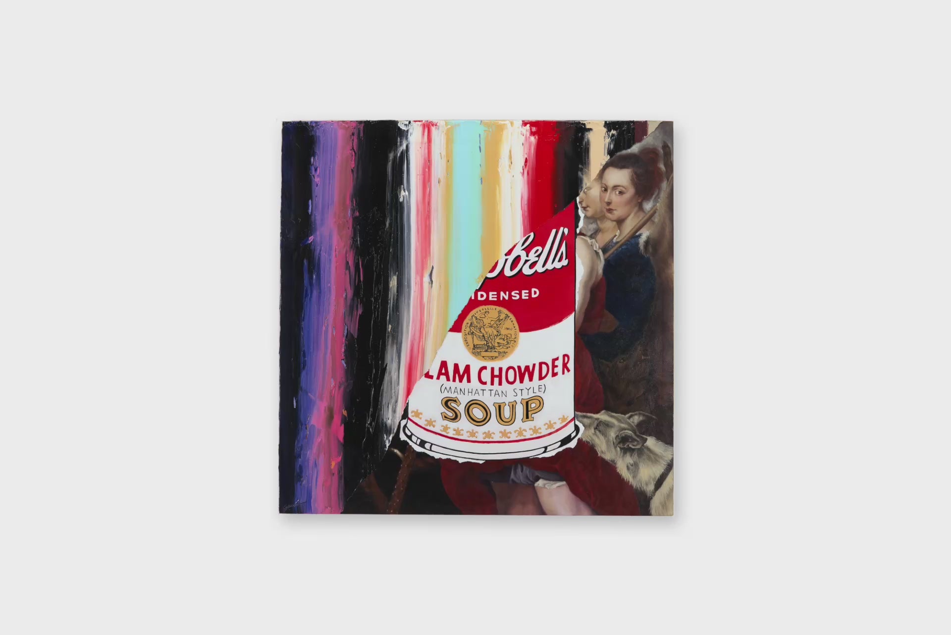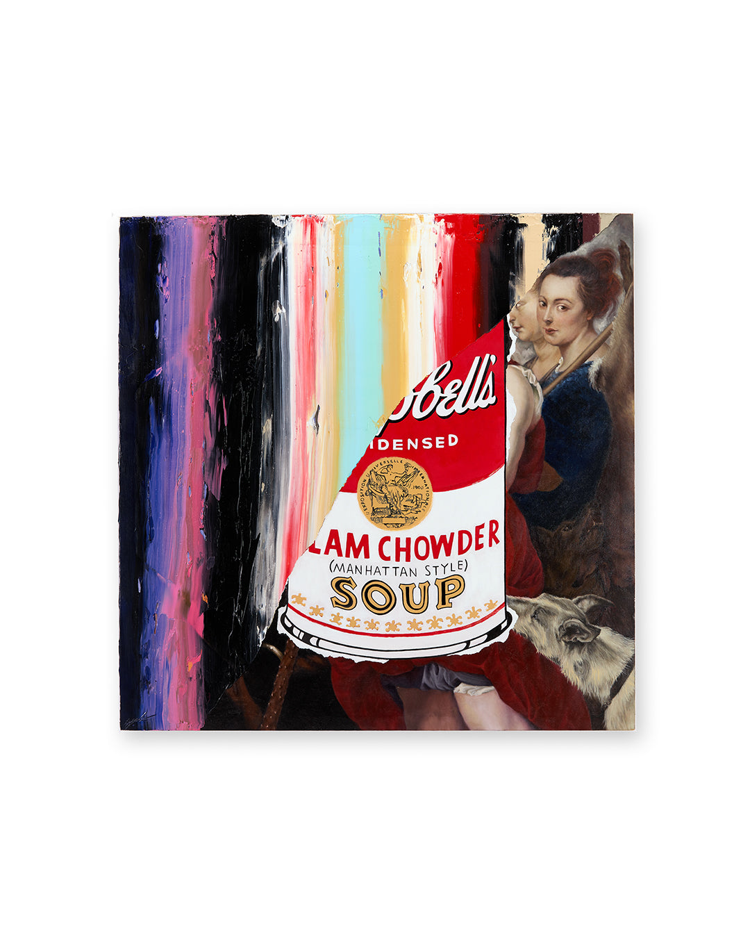 Striped bands of color run vertically across the surface, textured and bold. Between the layers, a flash of Pop art appears; the unmistakable Warhol soup can hovers like a relic caught between worlds. Beneath it all, fragments of Baroque-style figures emerge, their classical forms pressing up against the contemporary sheen.