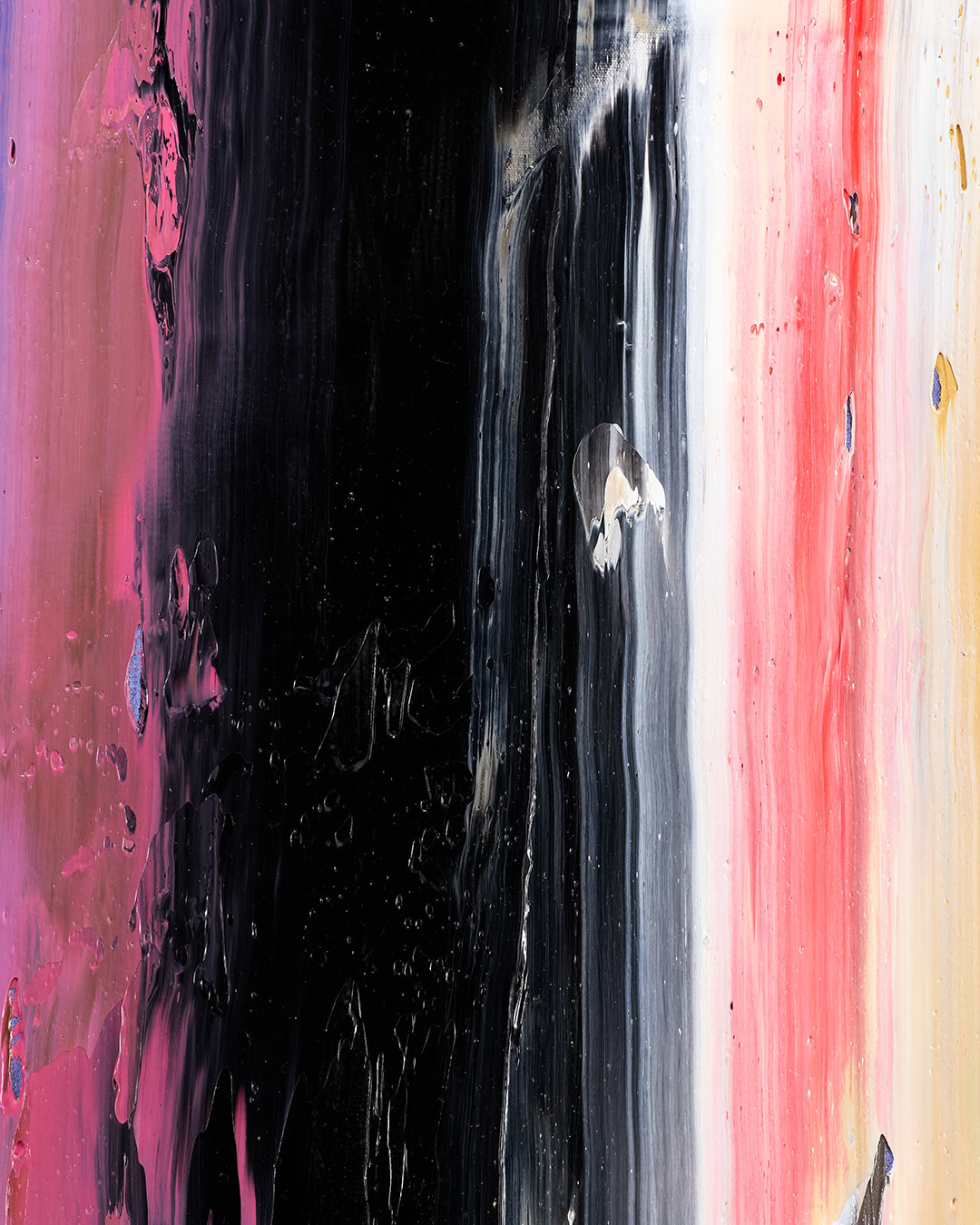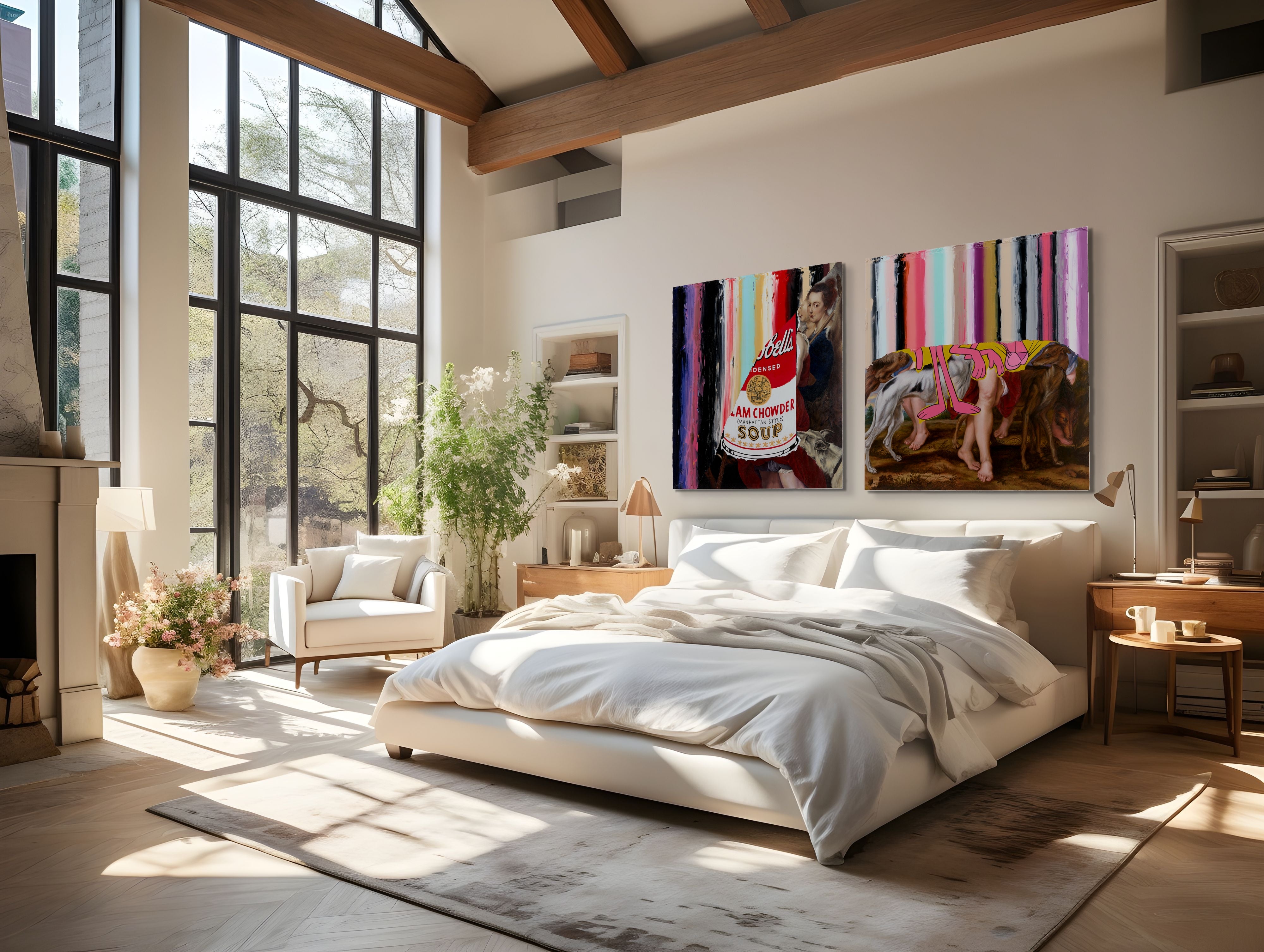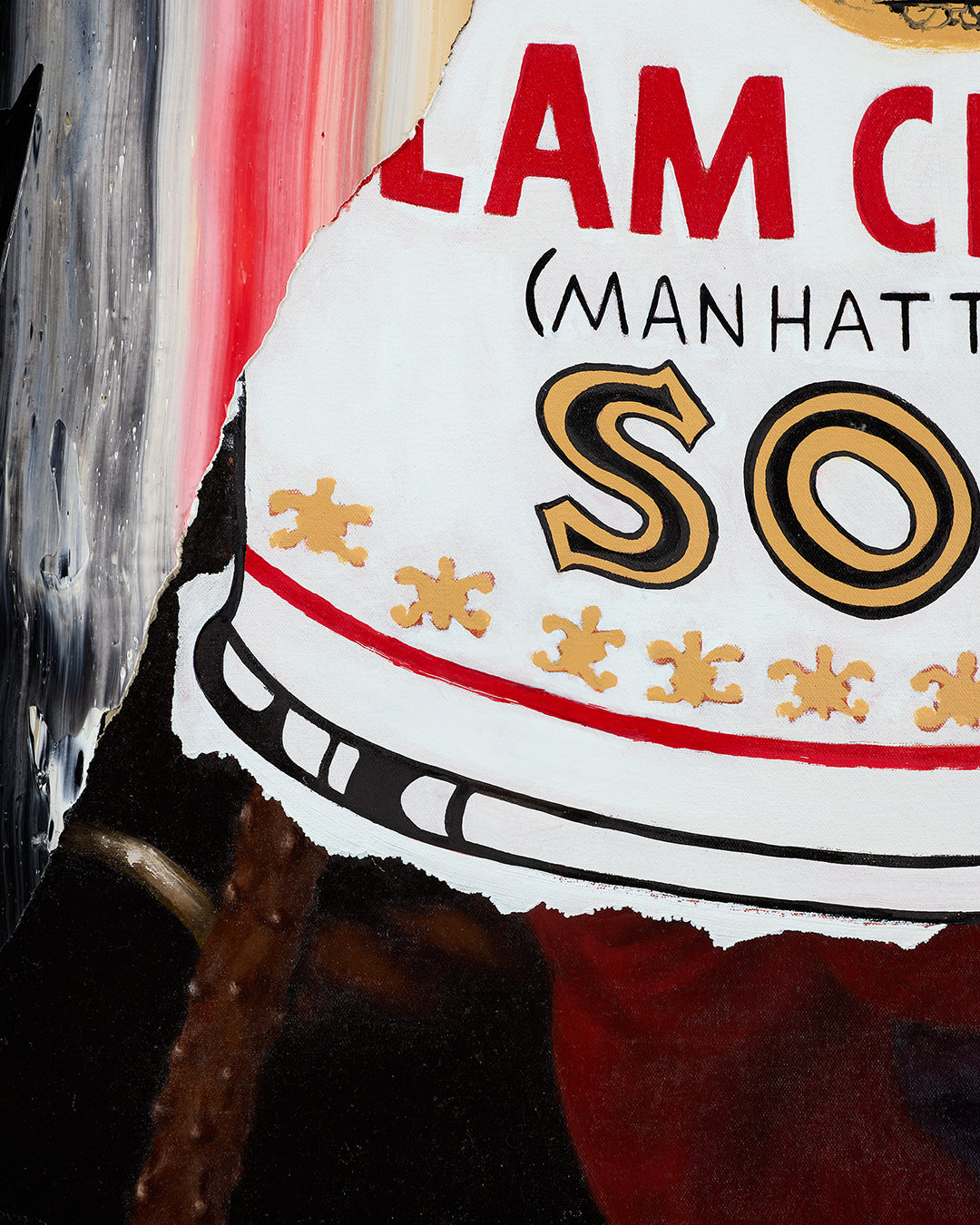 Striped bands of color run vertically across the surface, textured and bold. Between the layers, a flash of Pop art appears; the unmistakable Warhol soup can hovers like a relic caught between worlds. Beneath it all, fragments of Baroque-style figures emerge, their classical forms pressing up against the contemporary sheen.